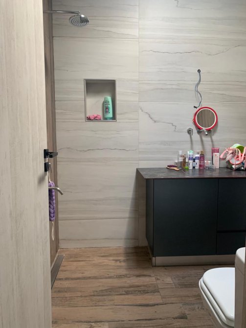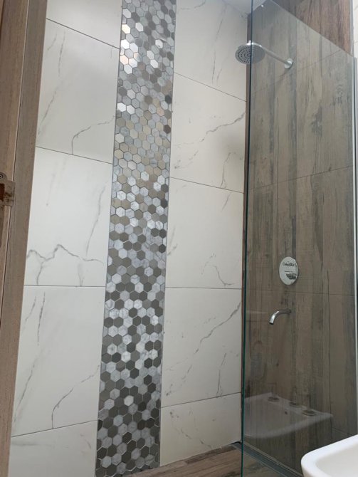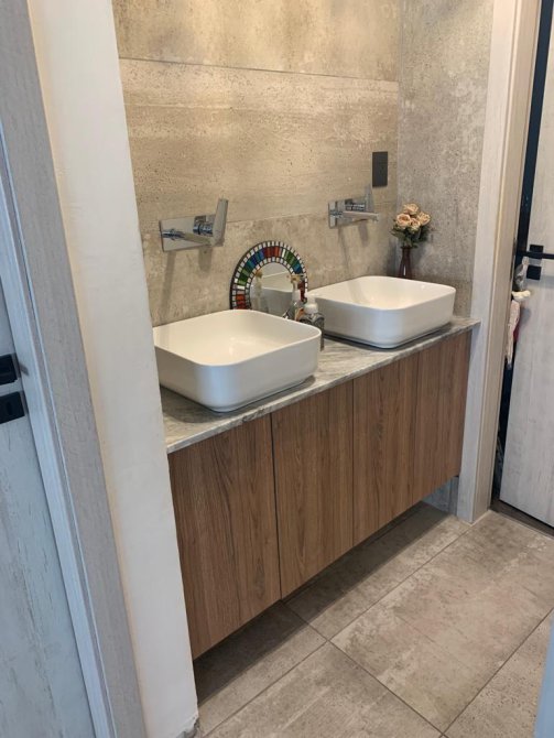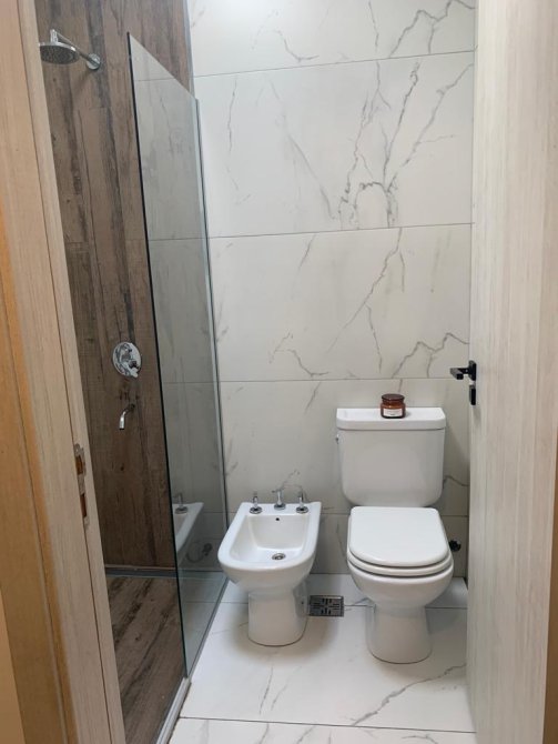 Antebaño en zona de living de alta categoría con doble bacha y doble grifería monocomado sobre mesada de mármol de carrara, con bajo mesada soft-close. Baño de uso común frente a antebaño con artefactos, ducha, vidrio templado fijo de cerramiento, desagüe lineal (Atrim) y terminaciones de calidad. Piso y paredes revestido con porcellanato de primera calidad.