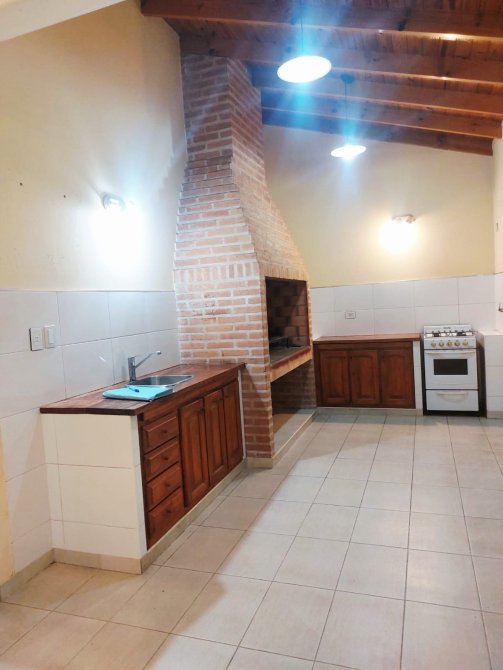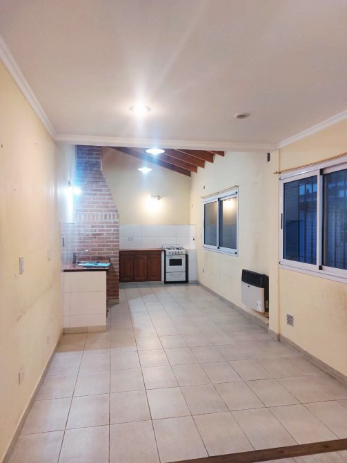 SE INGRESA AL RECIBIDOR. COCINA COMEDOR DE 2.70 X 6 METROS CON PISO CERAMICO, VENTANALES AL EXTERIOR, AMOBLAMIENTOS DE COCINA, MESADA DE MADERA CON BACHA Y GRIFERIA MONOCOMANDO, ARTEFACTO DE COCINA, ESTUFA T/B Y MESADA ADICIONAL DE MADERA CON MUEBLE INFERIOR Y GRAN PARRILLA CON TIRAJE AL EXTERIOR.